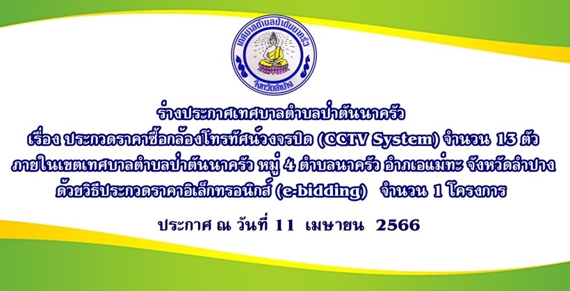 เทศบาลตำบลป่าตันนาครัว ประชาสัมพันธ์ร่างประกาศเทศบาลตำบลป่าตันนาครัว เรื่อง ประกวดราคาซื้อกล้องโทรทัศน์วงจรปิด (CCTV System)จำนวน 13 ตัว ภายในเขตเทศบาลตำบลป่าตันนาครัว หมู่ 4 ตำบลนาครัว ด้วยวิธีประกวดราคาอิเล็กทรอนิกส์ (e-bidding) จำนวน 1 โครงการ ประกาศ ณ วันที่ 11 เมษายน 2566 ดาวน์โหลดรายละเอียดได้ที่นี้