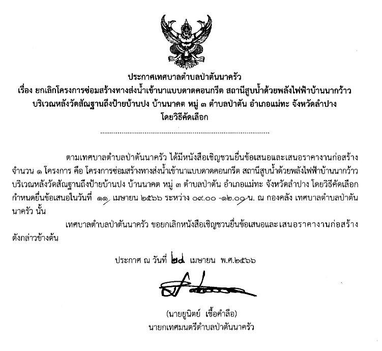 ประกาศเทศบาลตำบลป่าตันนาครัว เรื่องยกเลิกโครงการซ่อมสร้างทางส่งน้ำเข้านาแบบดาดคอนกรีต สถานีสูบน้ำด้วยพลังไฟฟ้าบ้านนากว้าวบริเวณหลังวัดสันฐานถึงป้ายบ้านปง บ้านนาคต หมู่ 3 ตำบลป่าตัน อำเภอแม่ทะ จังหวัดลำปาง โดยวิธีคัดเลือก จำนวน 1 โครงการ ประกาศ ณ วันที่ 27 เมษายน 2566 ดูรายละเอียดทั้งหมดได้ที่นี้