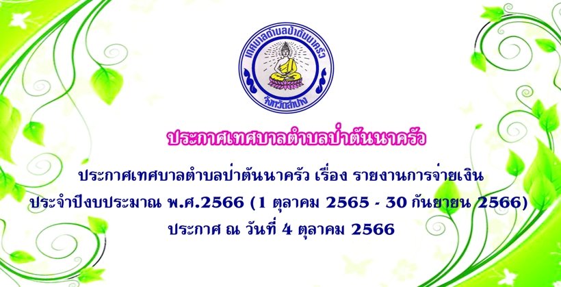 เทศบาลตำบลป่าตันนาครัว ประชาสัมพันธ์ ประกาศเทศบาลตำบลป่าตันนาครัว เรื่อง รายงานการจ่ายเงินประจำปีงบประมาณ พ.ศ.2566 (1 ตุลาคม 2565 – 30 กันยายน 2566) ประกาศ ณ วันที่ 4 ตุลาคม 2566