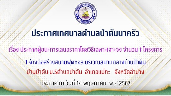 1.จ้างก่อสร้างสนามฟุตซอล บริเวณสนามกลางบ้านป่าตัน บ้านป่าตัน ม.5ตำบลป่าตัน อำเภอแม่ทะ จังหวัดลำปาง