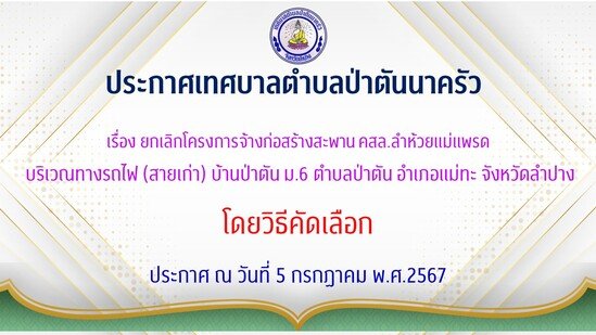 ประชาสัมพันธ์ เทศบาลตำบลป่าตันนาครัว Share ประกาศเทศบาลตำบลป่าตันนาครัว เรื่อง ยกเลิกโครงการจ้างก่อสร้างสะพาน คสล.ลำห้วยแม่แพรด บริเวณทางรถไฟ (สายเก่า) บ้านป่าตัน ม.6 ตำบลป่าตัน อำเภอแม่ทะ จังหวัดลำปาง โดยวิธีคัดเลือก ดาวโหลดเอกสารได้ที่นี่ 20240705150140 Share FacebookTwitterGoogle+ReddItWhatsAppPinterestEmail