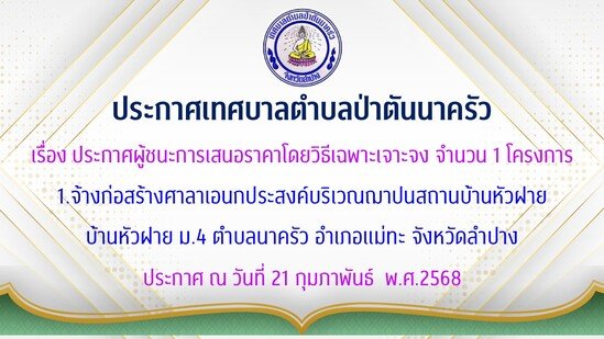 ประชาสัมพันธ์ เทศบาลตำบลป่าตันนาครัว Share ประกาศเทศบาลตำบลป่าตันนาครัว เรื่อง ประกาศผู้ชนะการเสนอราคาโดยวิธีเฉพาะเจาะจง จำนวน 1 โครงการ 1.จ้างก่อสร้างศาลาเอนกประสงค์บริเวณฌาปนสถานบ้านหัวฝาย บ้านหัวฝาย ม.4 ตำบลนาครัว อำเภอแม่ทะ จังหวัดลำปาง ดาวโหลดเอกสารได้ที่นี่ จ้างก่อสร้างศาลาเอนกประสงค์บริเวณฌาปนสถานบ้านหัวฝาย Share FacebookTwitterGoogle+ReddItWhatsAppPinterestEmail