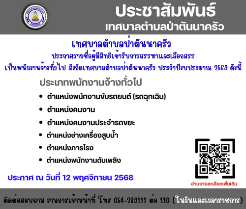 ประกาศเทศบาลตำบลป่าตันนาครัว ประกาศรายชื่อผู้มีสิทธิเข้ารับการสรรหาและเลือกสรร เป็นพนักงานจ้างทั่วไป สังกัดเทศบาลตำบลป่าตันนาครัว ประจำปีงบประมาณ 2569