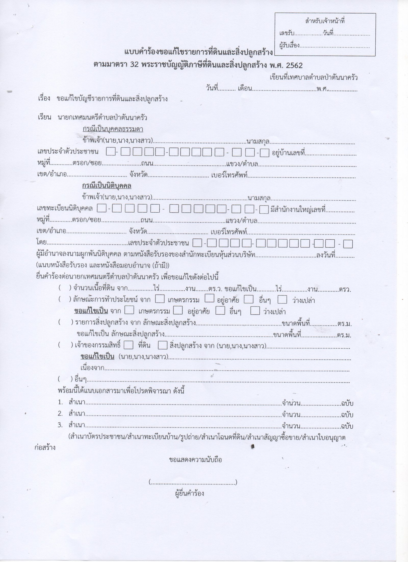 ประชาสัมพันธ์ประชาชนที่ประสงค์ขอแก้ไขบัญชีรายการที่ดินและสิ่งปลูกสร้าง ตามแบบคำร้องขอแก้ไขรายการที่ดินและสิ่งปลูกสร้าง ตามมาตรา 32 พระราชบัญญัติภาษีที่ดินและสิ่งปลูกสร้าง พ.ศ.2562