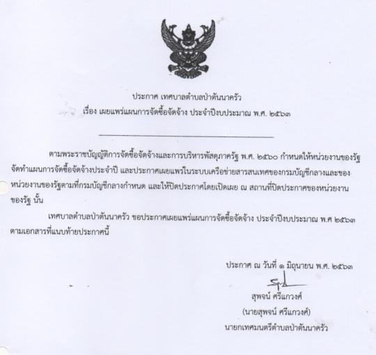 ประกาศเทศบาลตำบลป่าตันนาครัว เรื่อง เผยแพร่แผนหารจัดซื้อจัดจ้าง ประจำปีงบประมาณ พ.ศ.2563