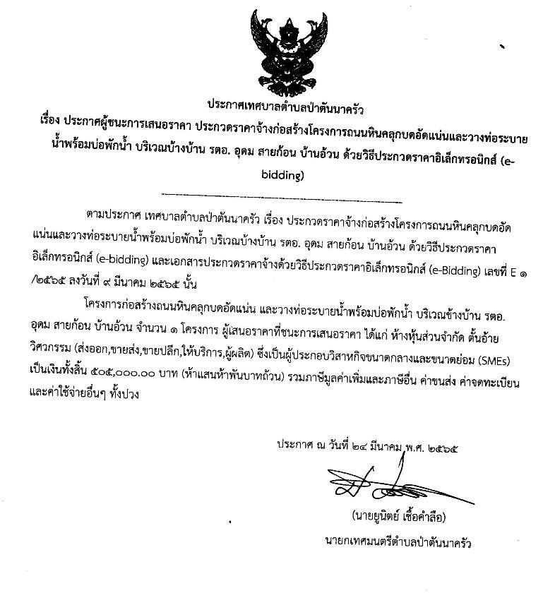 ประกาศผู้ชนะการเสนอราคา การประกวดราคาจ้างก่อสร้างโครงการถนนหินคลุกบดอัดแน่นและวางท่อระบายน้ำพร้อมบ่อพัก บริเวณบ้าน รตอ.อุดม สายก้อน บ้านอ้วน