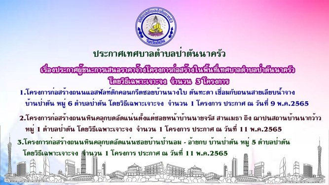 ประกาศเทศบาลตำบลป่าตันนาครัว เรื่องประกาศผู้ชนะการเสนอราคาจ้างโครงการก่อสร้างในพื้นที่เทศบาลตำบลป่าตันนาครัว โดยวิธีเฉพาะเจาะจง จำนวน 3 โครงการ ดังนี้