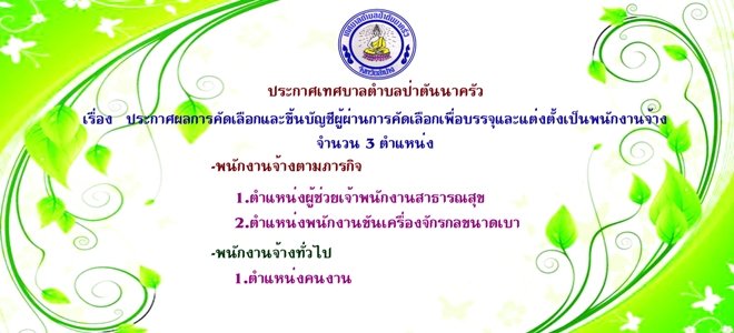 ประกาศเทศบาลตำบลป่าตันนาครัว เรื่องประกาศผลการคัดเลือกและขึ้นบัญชีผู้ผ่านการคัดเลือกเพื่อบรรจุและแต่งตั้งเป็นพนักงานจ้าง จำนวน 3 ตำแหน่ง