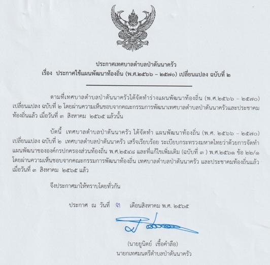 ประกาศเทศบาลตำบลป่าตันนาครัว เรื่อง ประกาศใช้แผนพัฒนาท้องถิ่น(พ.ศ.2566-2570) เพิ่มเติมฉบับที่ 2