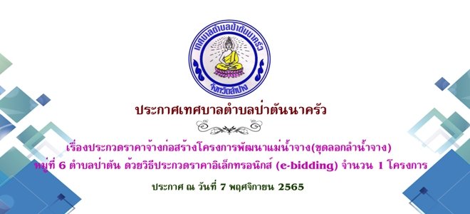 ประกาศเทศบาลตำบลป่าตันนาครัว เรื่องประกวดราคาจ้างก่อสร้างโครงการพัฒนาแม่น้ำจาง(ขุดลอกลำน้ำจาง) หมู่ที่ 6 ตำบลป่าตัน ด้วยวิธีประกวดราคาอิเล็กทรอนิกส์ (e-bidding) จำนวน 1 โครงการ